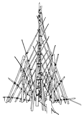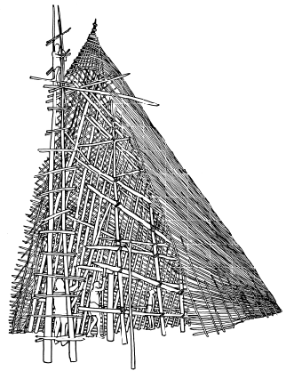 Construction details, Maprik area haus tambaran. Ruff drawing from a 1950's photo by Anthony Forge. |
