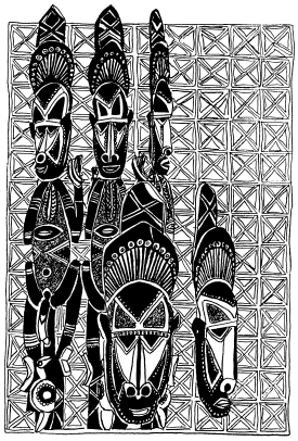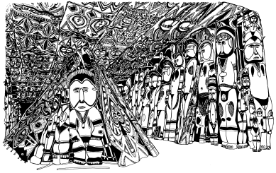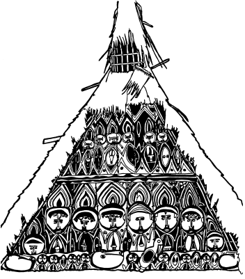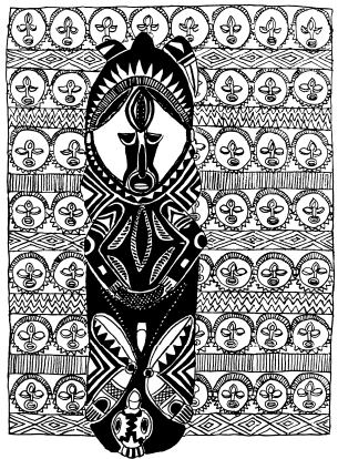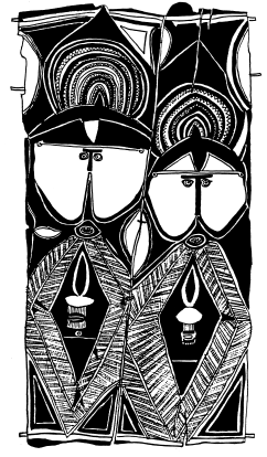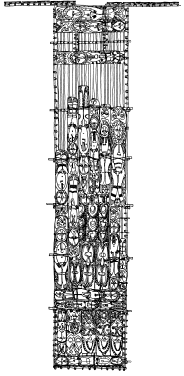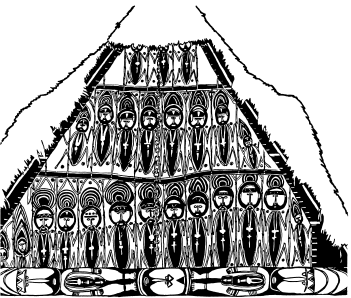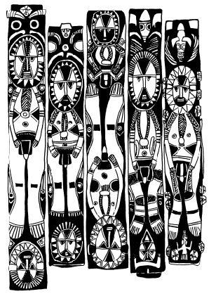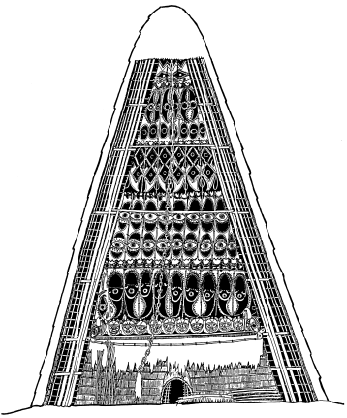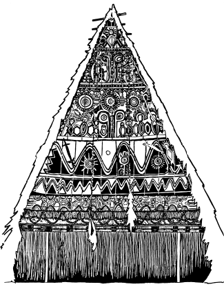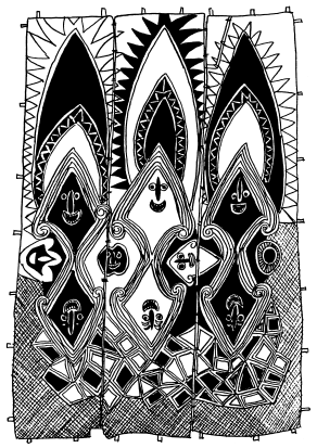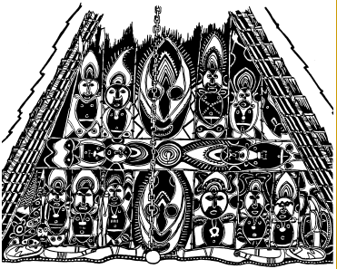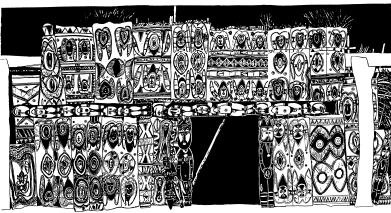 Haus tambaran facade, Mambauro village, Yangoru area of the Maprik. Ruff drawing after field trips in 1977 and 1978. |