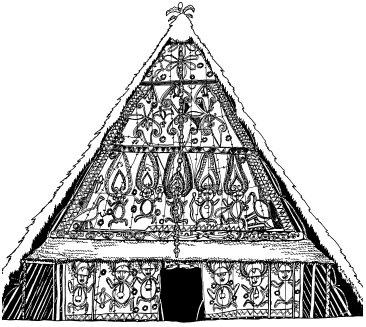 Facade of the Jambitanget village ceremonial house, Wosera. Ruff drawing after a 1978 field trip. |