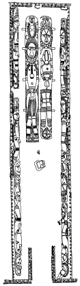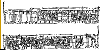 Tikit (lintel) of the ceremonial haus at Ami school, north Maprik, Ruff drawing from field notes of 1978. The top section of the drawing is the left end of lintel, and the bottom section is the right half, as an observer stands facing the ceremonial haus. |