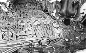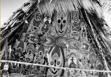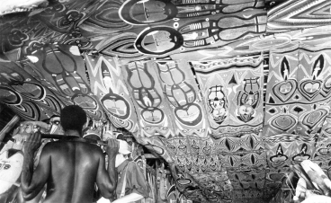 Interior of Serakim ceremonial house, 1979. Compare these bark painted forms with previous drawings. |