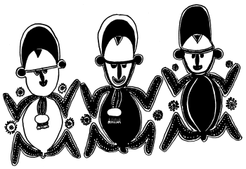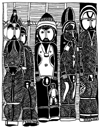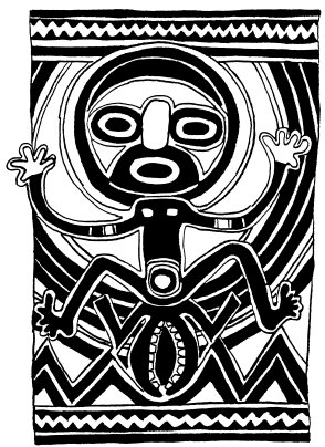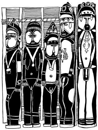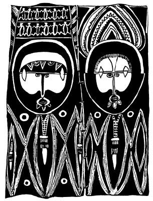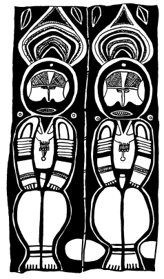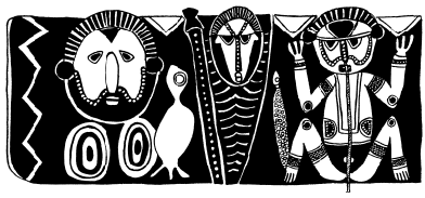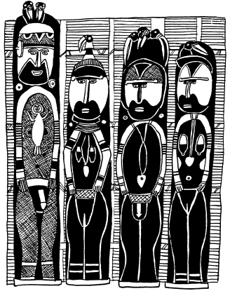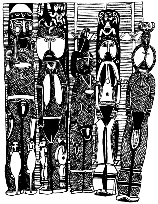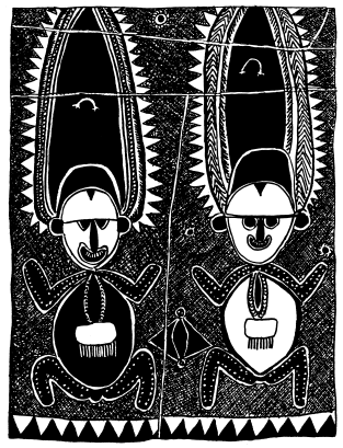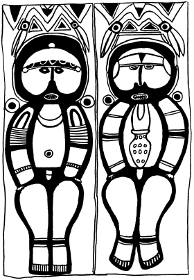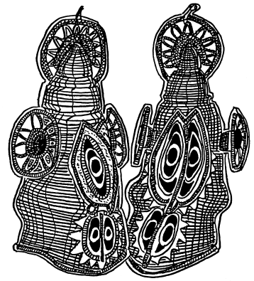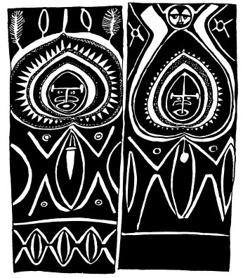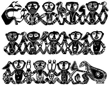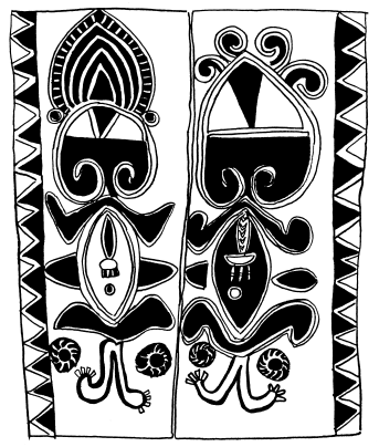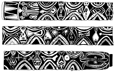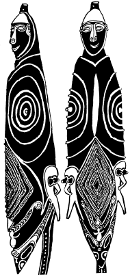 Figures on a bark painting, Serakim village, Wosera. Ceremonial house now in the British Museum, London. Ruff drawing from field notes of 1977. |