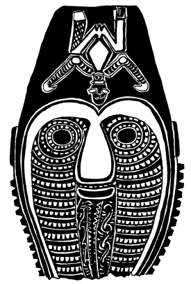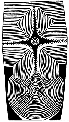 Enlarged motif from the tip of a canoe paddle (see preceding entry) from the Goam River area. Motifs are stained in black onto natural wood with a water-resistant tree sap. The short length of the handle on this paddle indicates that it was a woman’s possession. Collected in 1958. |