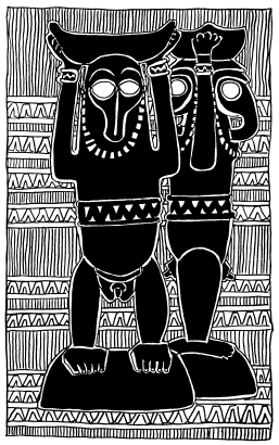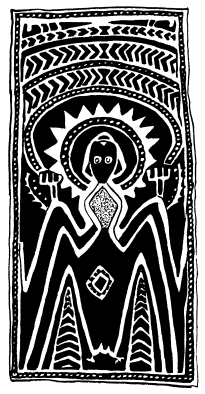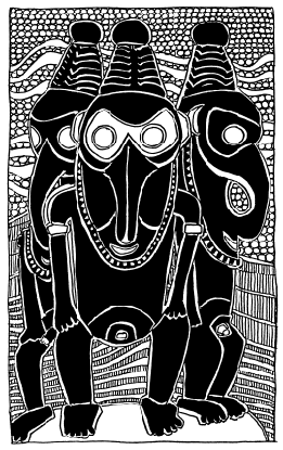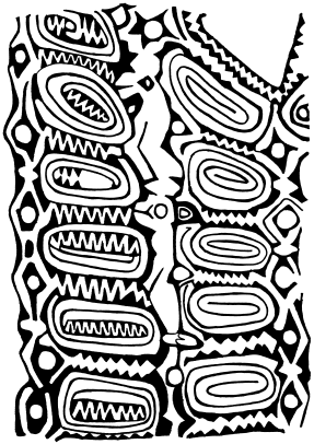 Bark painting from the interior of a disintegrating ceremonial house, Bosman village. Drawn following a 1980 field trip. |