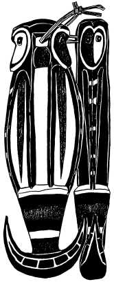 Front and profile views of a Janus face suspension hook from the Goam River area. Red ochre, and black and white are the predominating colours. Private collection, USA. Collected in 1967. |