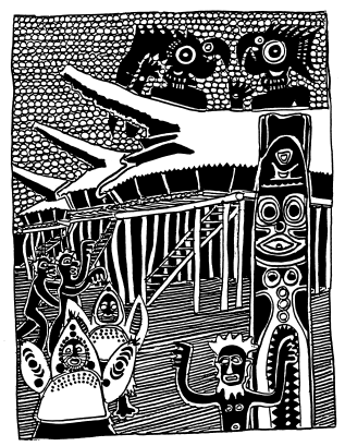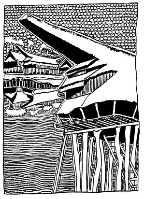 Ruff’s impression of the architecture and activities of Kambaramba village taken from an old photograph. Present day Kambaramba has no ceremonial houses with projecting gables. |