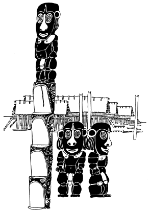 Carved house step topped with a male figure, houses in the background show the steps in use. Beside the steps are two views of the carved figure. Location and date unknown. |