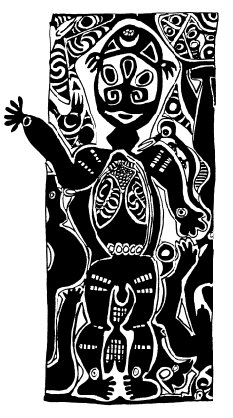 Drawing of a bark painting from Newton, D - "New Guinea Art in the Collection of the Museum of Primitive Art", New York Graphic Society, New York,1967, p 45, who indicates "The X-ray style of the torsos displaying some of the internal organs, is most unusual." Attributed to the Kambot, Keram River. Collection of the Museum of Primitive Art, New York. (Now in the Metropolitan Museum, #56.264). |