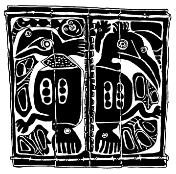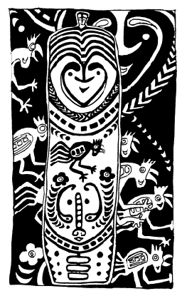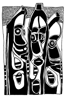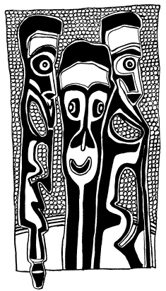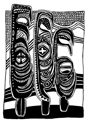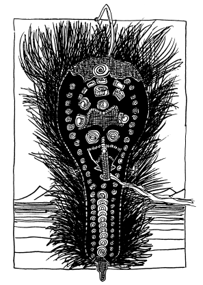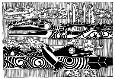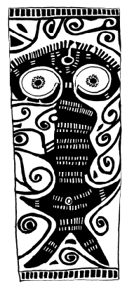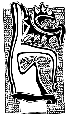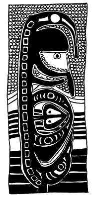 Drawing reconstructed from an old bark painting in the Kambot ceremonial haus Bonjo. Motifs on the painting were barely discernable by the time of the 1980 field trip. |