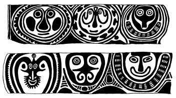 Motifs from a portion of a bark painting from Kumbragumbra village. Kelm, "Kunst Vom Sepik", Veroffentlichungen des Museum fur Volkerkunde, Berlin,1966, Vol. III, p 306. Sepik expedition of 1912/13. Museum fur Volkerkunde, Berlin, VI 41 831. |