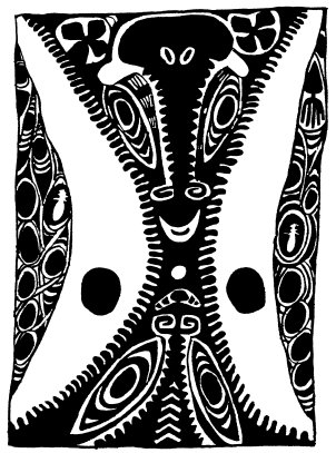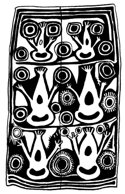 Drawing by Ruff, of a lower Sepik bark painting from Kelm, "Kunst Vom Sepik", Veroffentlichungen des Museum fur Volkerkunde, Berlin,1966, Vol. III, p 293. Sepik expedition of 1912/13. Museum fur Volkerkunde, Berlin, VI 49 394. |