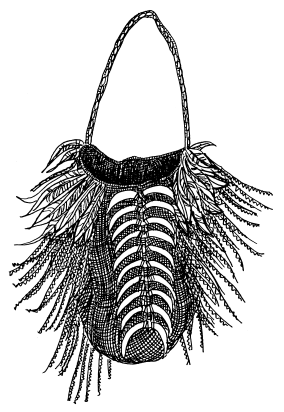 Head hunting bilum or head carrying bag, Asangumut village, Yuat River, 1981. Named Maiban, the bag was made by Yanakuli, grandfather of the village informant. The nine pairs of pig’s tusks indicate that nine heads were taken in battle and were transported in the bag. |