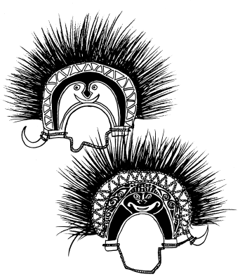 Front and back views of a dance head-dress, Asangumut village, Yuat River, 1981. It was made by Yambekipan, in 1976. The faces represent Yambi or Yambikipan, the masalai spirit after whom the maker was named. Made of cassowary and cockatoo feathers, on a flat curved and painted board. Job’s tears seeds, and red, black and white paints are used for ornaments. Craig, B - "Report for the Papua New Guinea National Museum and Art Gallery, of a Field Trip to the Sepik, Oct 19 - Nov 29, 1981", 1981, p 140. |