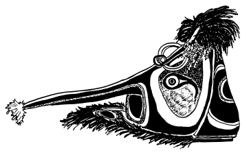 Second mask of Akarun, Yuat River. This is a more recent mask than Pansimakan; both masks represent styles "owned" by men of Kinakaten and Akarun only. It is believed the masks can reveal (though dreams) the success or otherwise of proposed hunting trips; they help hunters find game quickly. Craig, B - "Report for the Papua New Guinea National Museum and Art Gallery, of a Field Trip to the Sepik, Oct 19 - Nov 29, 1981", 1981, p 146. |