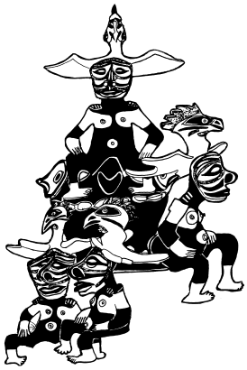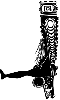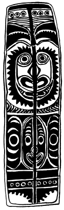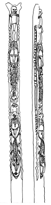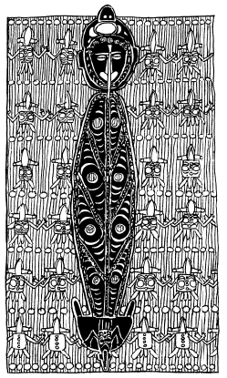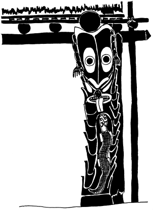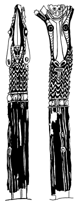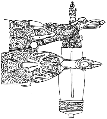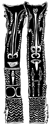 Ruff drawing of an Iatmul post, after Kelm, "Kunst Vom Sepik", Veroffentlichungen des Museum fur Volkerkunde, Berlin,1966, Vol. I, #397. Collected by Neuhaus in 1909. Museum fur Volkerkunde, Berlin, VI 30 540. This is similar to a large carved post which stood at the entrance to Kanganaman village in 1974-75 and which has now completely disintegrated. |