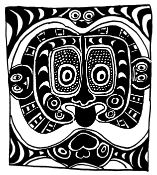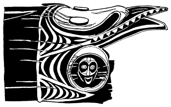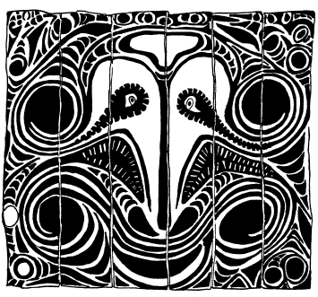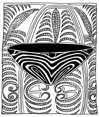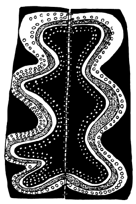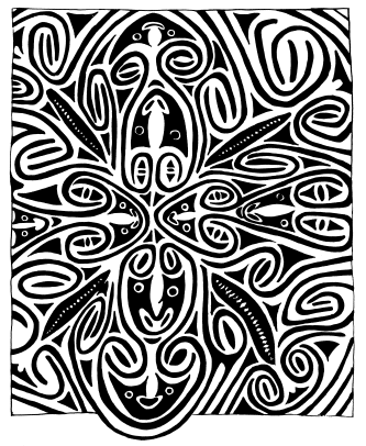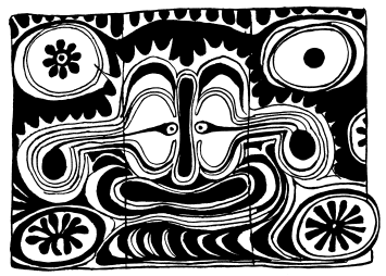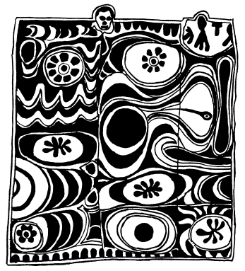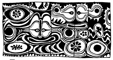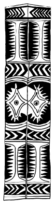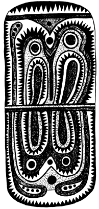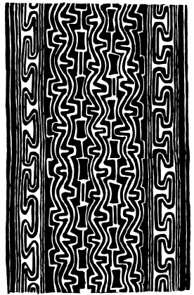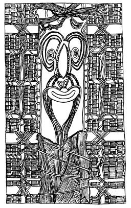 Motif from a bark screen which was used on the upper floor of the Kanganaman village haus tambaran Wolimbit. The screen used during initiation ceremonies was kept in place while new initiates were inside the haus tambaran. This drawing was made from the very dim outlines of faded paint still visible on the screen in 1979. |