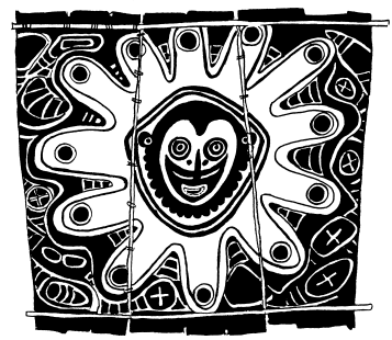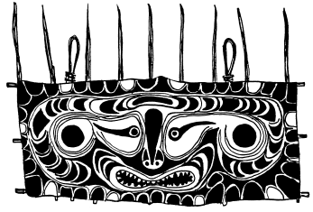 Painted bark panel braced on a wicker frame which was suspended in the gable overhang of the front portion of a Tambanum village dwelling house, 1978. |