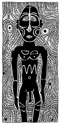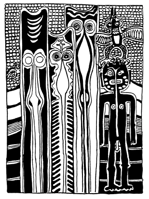 Ruff’s impression of figures from a Yentchanmangua village bark painting from Kelm, "Kunst Vom Sepik", Veroffentlichungen des Museum fur Volkerkunde, Berlin,1966, Vol. I, #237. Collected during the Sepik expedition of 1912/13. Museum fur Volkerkunde, Berlin, VI 48 173. |