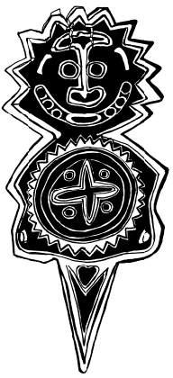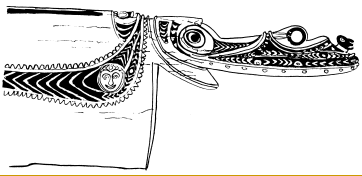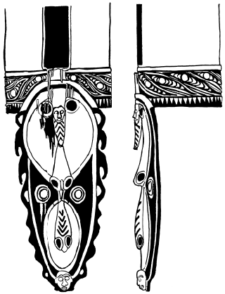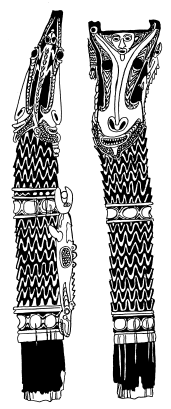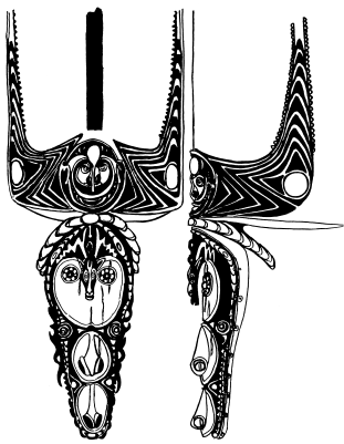 Motif from an old spear, Darapap village. The name of this spear is Nakorub. (D. Lipset). The spear originally came from a place named Sanai which existed before the split of Karau/Mendam/Darapap villages into separate entities. Araro of Mangaren clan was the owner. Araro married a Sait group wife, and when the Kopar Sait people joined those of Karau, they brought the spear with them. (Boraman was the name of the beach village from which they came 200 years ago). Now the spear is owned by Ginau and kept in Numarum Taab (cult haus). Craig, B - "Report for the Papua New Guinea National Museum and Art Gallery, of a Field Trip to the Sepik, Oct 19 - Nov 29, 1981", 1981, p 156 (22). |