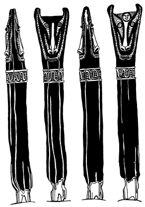 Enlarged details of bird figures from sago storage jars, Aibom village. |