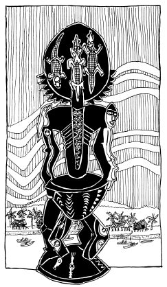 Bark panels painted with earth colours, charcoal and lime (red, black and white), Korogo village, 1979. Green snail shells, handed down within families from generation to generation, adorn the top of the construction. |