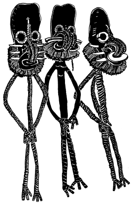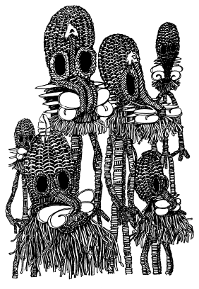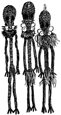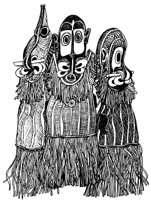 Three Saunman figures, Tambanum village. Unlike previous examples, which incorporated bast from the banana tree into the body portions, these are completely woven. |
