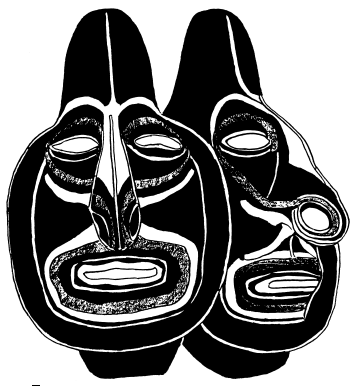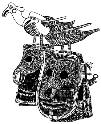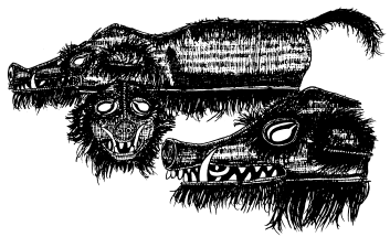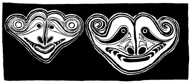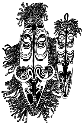 Front and profile views of two ceremonial masks in the haus tambaran at Lake Wagu, 1979. Created by men who had migrated to the Sepik area from the Hunstein mountain range. The hook forms represent "hornbill beaks". Orange clay, grey, white and black earth pigments were used. |