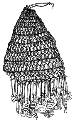 Ceremonial hat owned by the wife of Noah Kumot, Counsellor of Yentchan village. Natural fibres twined with old shell pendants. The shells are attached with newer twine, so may have come from an older form. Photographed in1981 while the owner was wearing the hat as part of her costume for Sing-Sings being staged for tourists from the Melanesian Explorer. |
