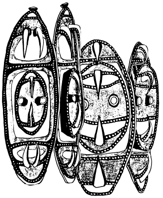 Kubkain war shields observed in 1977. Carved by Nario, who indicated that the faces represent Tumbuna (ancestor), and the notched details a puk puk (crocodile). "Smiling face" and notched details are typical for carvings from this area. |