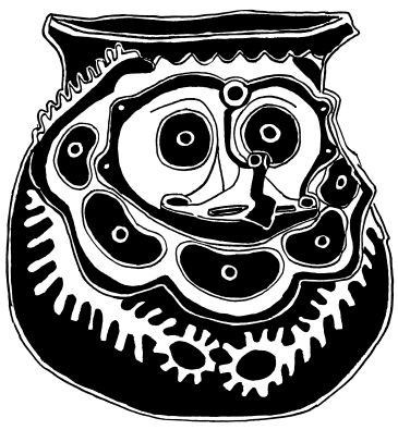 Nuguma area face pot, Amaki, #1, 1978. Dark charcoal color clay, with traces of lighter gray and dark red pigments. |