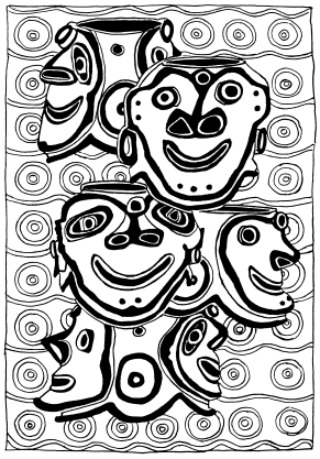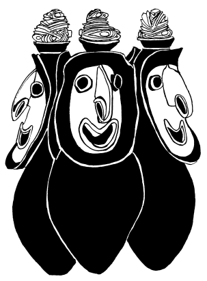 Piquant faces on sago storage pots, Aibom village. Women potters have a wide market for their cooking hearths and storage pots, which are traded for long distances up and down the Sepik. |