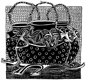 Three views of a smoke pot, Dimiri village, 1978. The small crocodile figure in the foreground is also made from clay. Fanciful figures of human and animal forms were termed "bransi" by the villagers, but no translation of this term was available. May, P & Tuckson, M - "The Traditional Pottery of Papua New Guinea", Sydney Bay Books, 1982, p 242, indicate that "modelled forms of faces, frogs or tortoises...are not traditional..." |