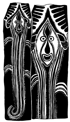 Two versions of a painted bark panel which was suspended high in a gable overhang of a Tambanum village dwelling house, 1978. |